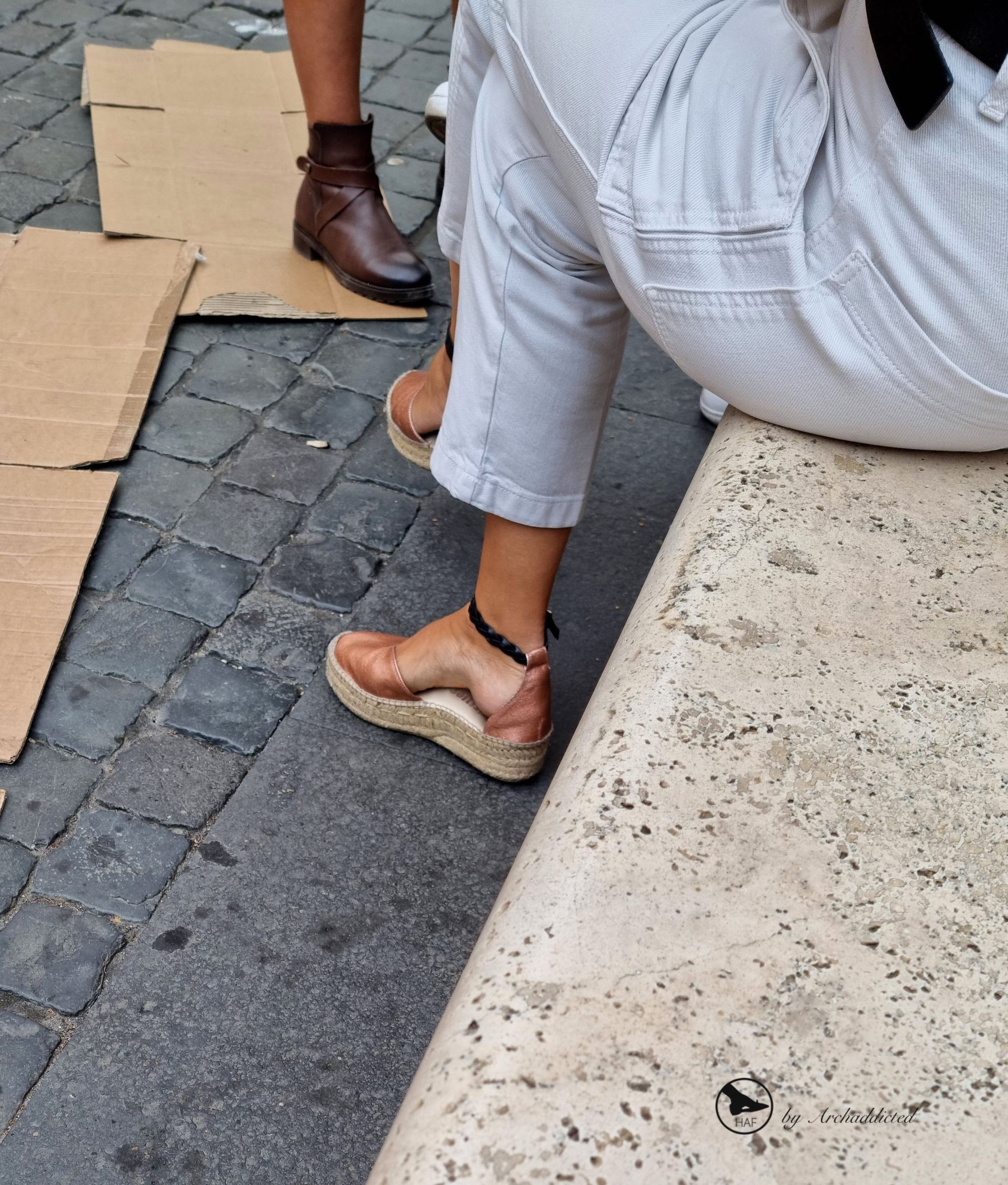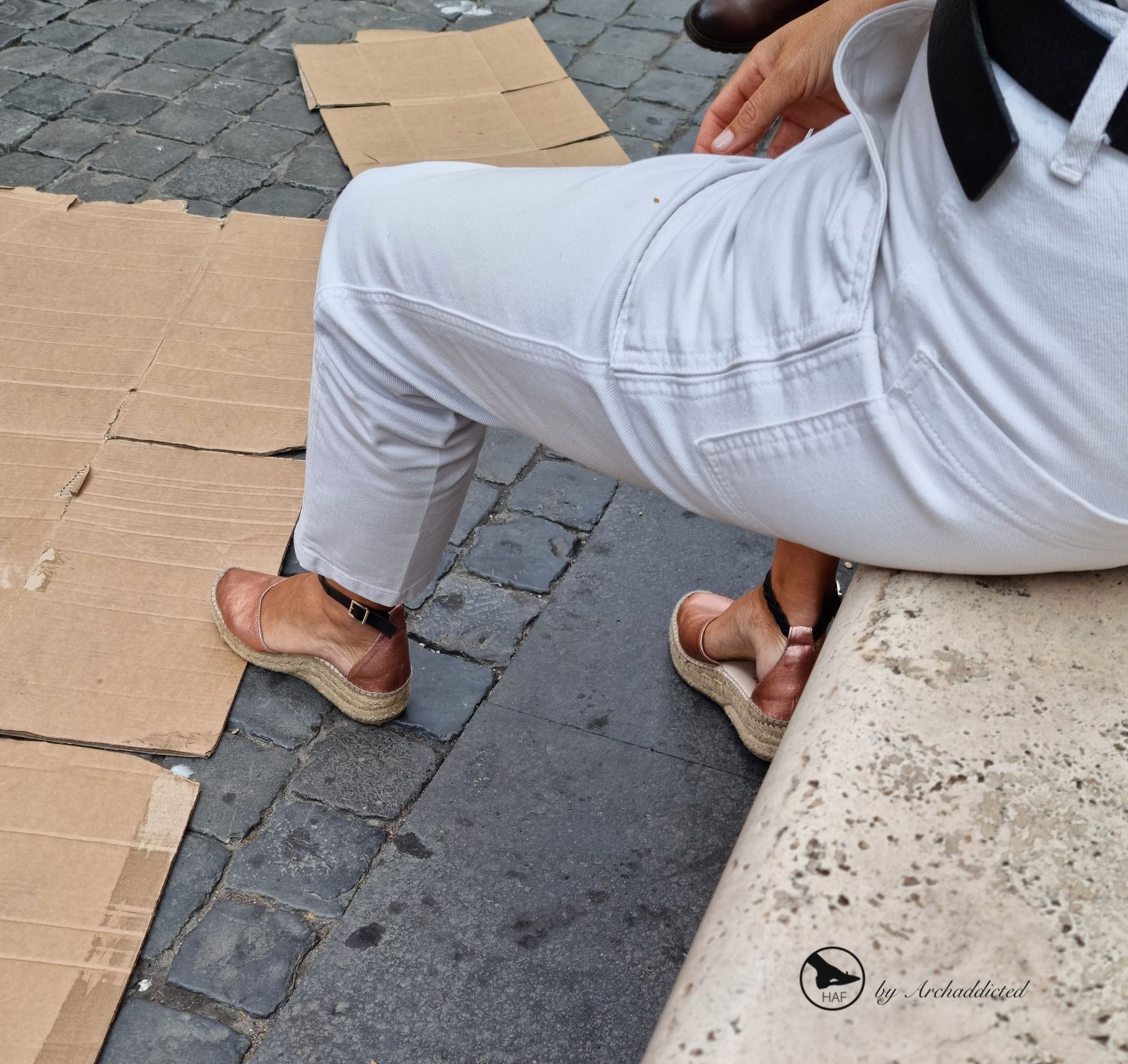 2022 late september in my haf city: I've got a real addiciton to women in espadrilles since I was a young boy. I consider these shoes timeless and really sexy beacause of the perfect frame they create sorrounding arches, especially wedged ones! This is a good example of what I mean: gold espadrilles with medium wedge for great bronzed arched feet showed by this girl during lunch-pause.