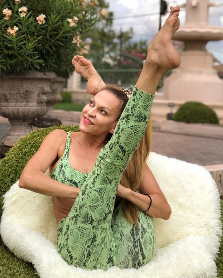 With each fluid movement, she effortlessly transitions from one yoga pose to another, her body displaying an exquisite combination of flexibility and strength. Every muscle in her body seems to be in perfect harmony, showcasing years of dedication and practice. As she stretched into each pose, her high arched feet became a focal point of her elegant form, adding a touch of unique beauty to her practice.
