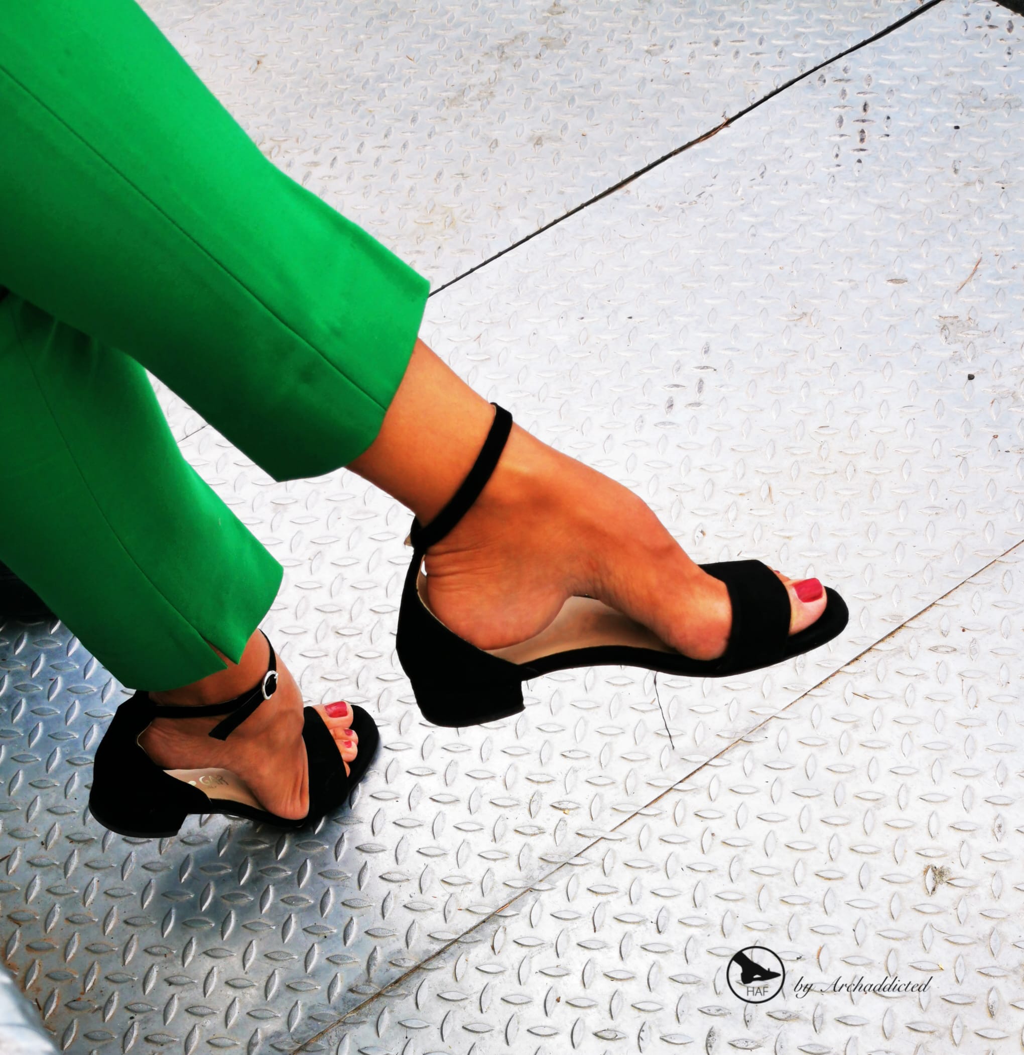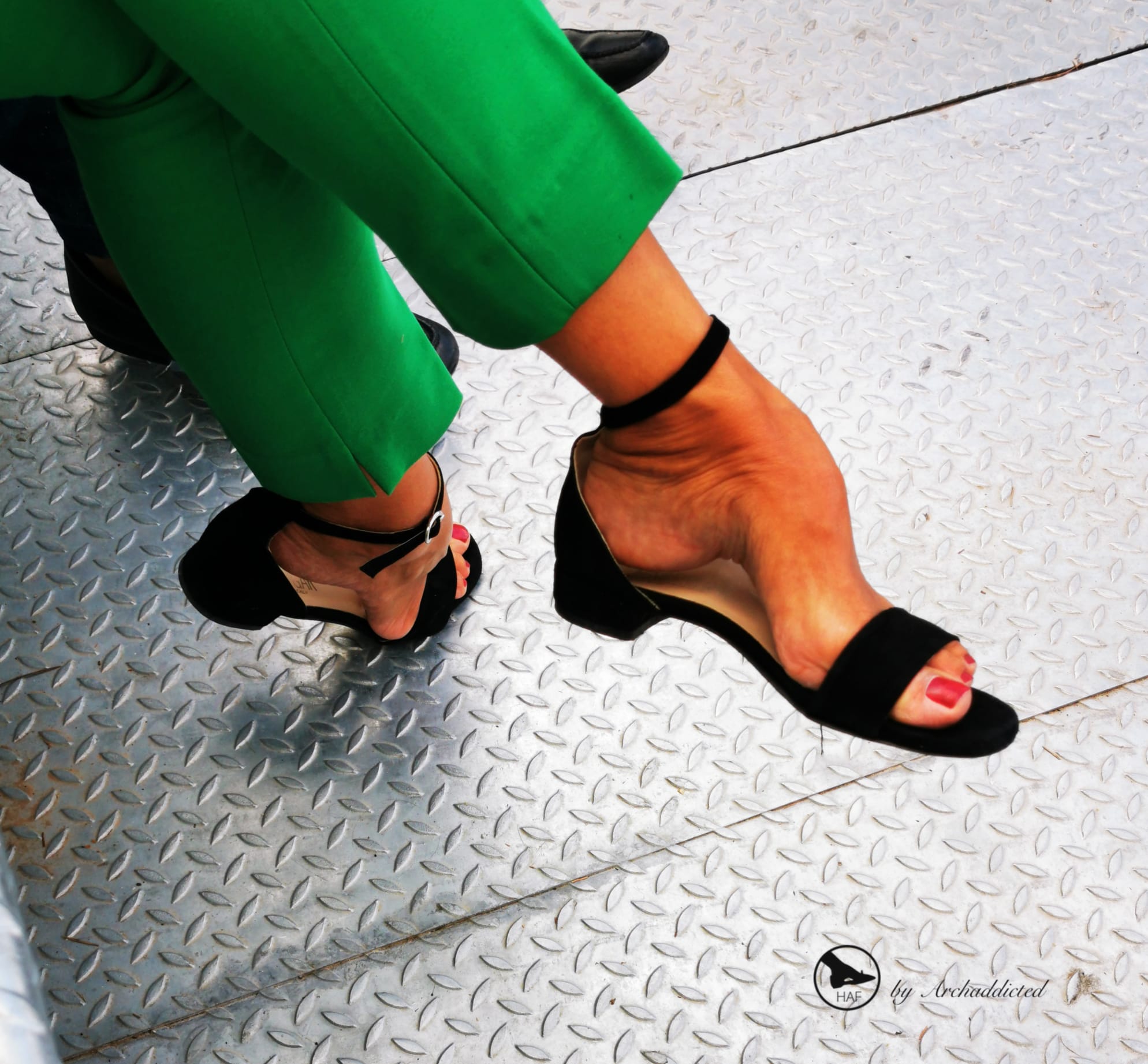 2019 early september in my haf city: met this elegant lady during fivb beach-volley tour on stands watching a match. I was really attracted by her mature bronzed strong and experienced high arched feet in low-heeled black sandals. She pointed, dipped and dangled them with strenght giving a great show hard to forget. I think these shots could prove it, aren't them!??