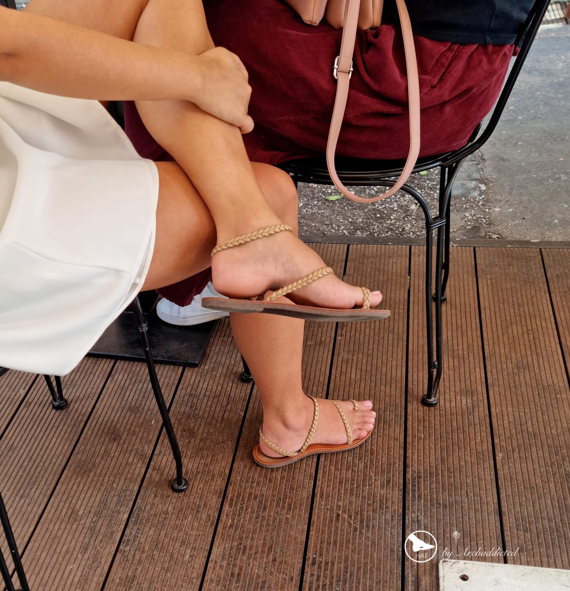 2022 half july in my haf city: met this beautiful brunette girl with white short dress, while she was having a coffee with a friend. Silky legs, strong calves, arched feet in flat minimal sandals and yummy pedicured toes are the ingredients of this great set...aren't them!??