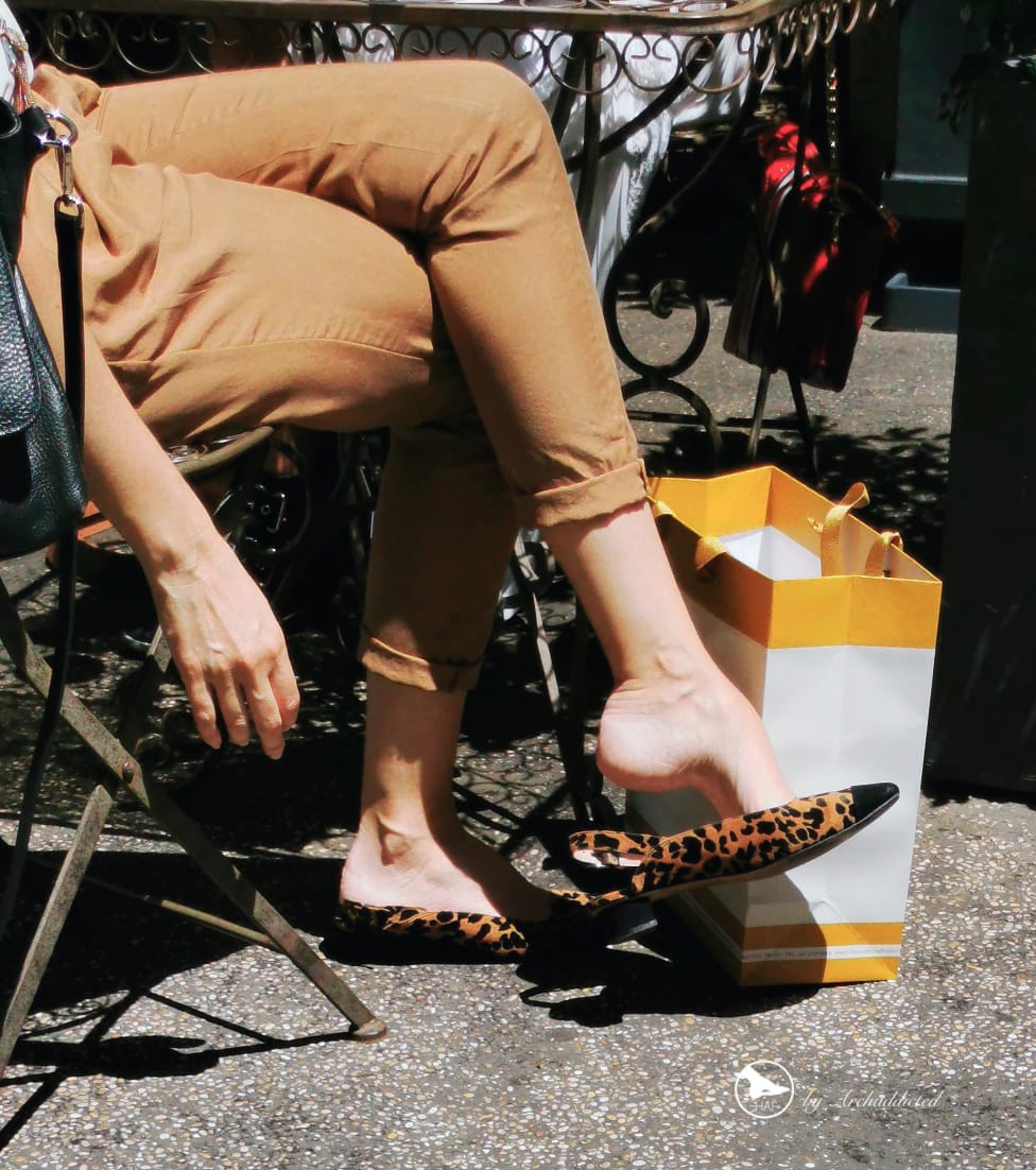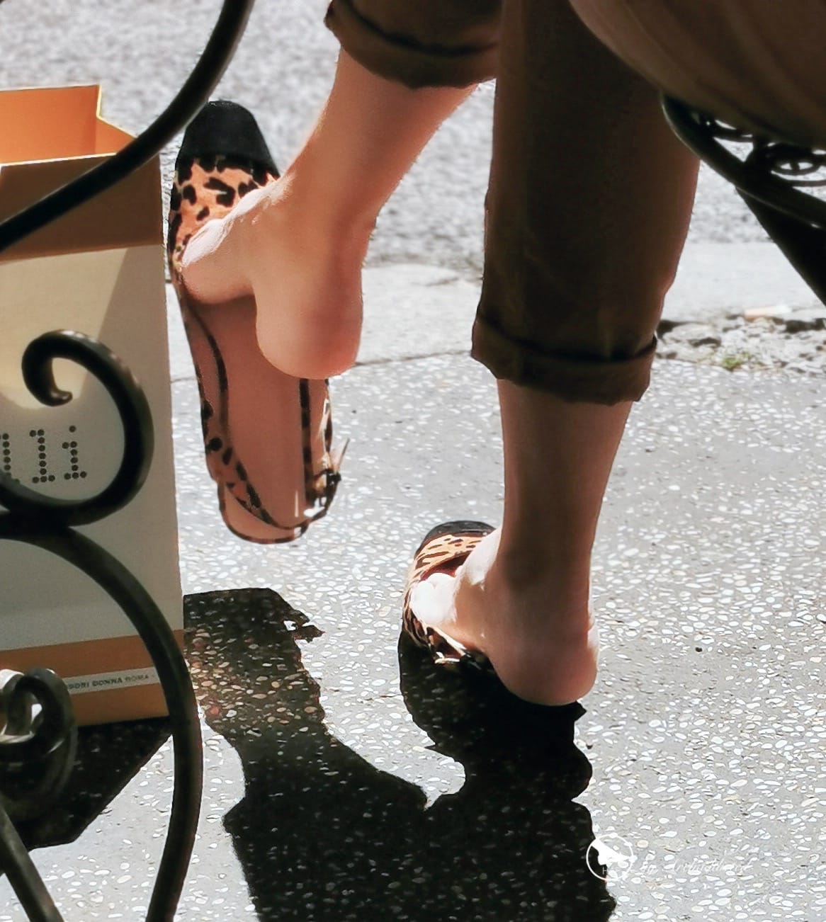 She gave a great slipping-out show from her slingback leopard sandals with her beautiful experienced inner and outer lickable high arched feet.