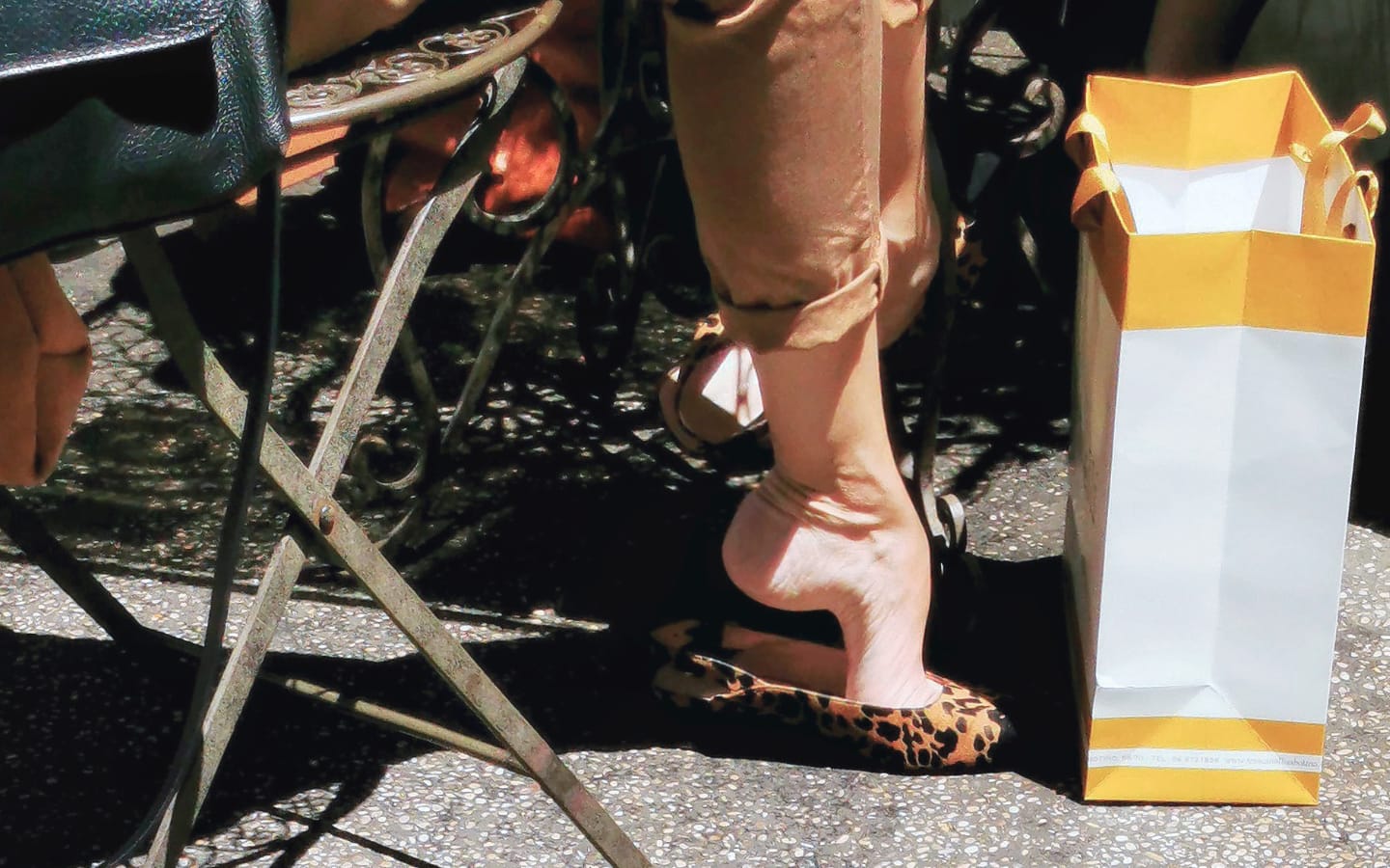 2022 late may in my haf city: met this sexy woman while she was having a business date with a coworker. They were so busy at their pad, then I was able to make some shots without raising suspicion. She gave a great slipping-out show from her slingback leopard sandals with her beautiful experienced inner and outer lickable high arched feet...stay tuned for the second part!!!