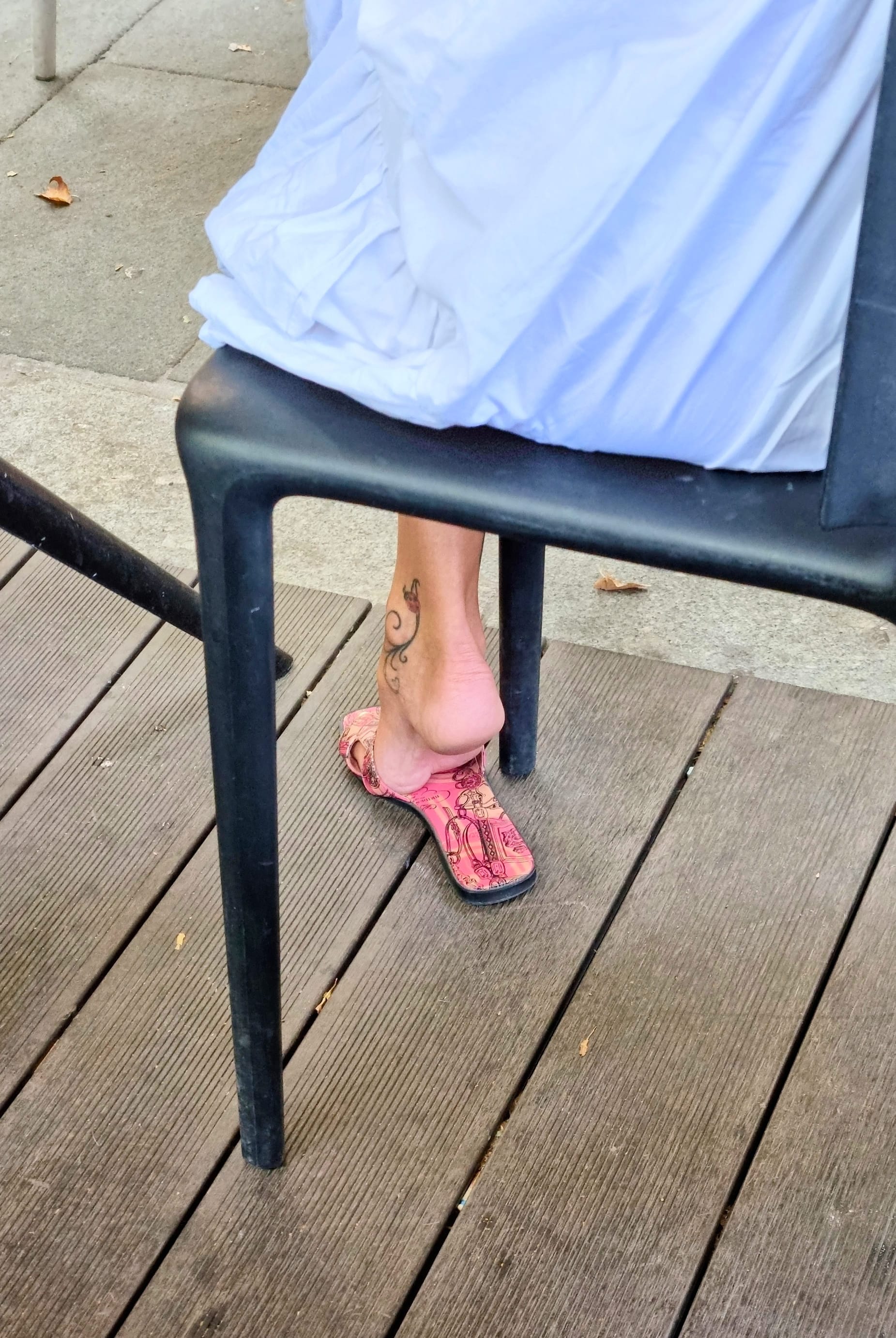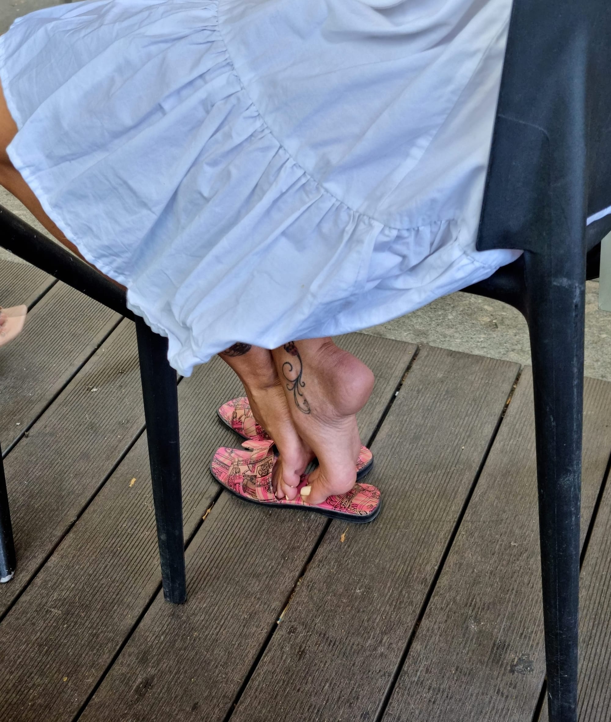 2022 late july in my haf city: I'm really proud to present on of my best sets ever!!! A beautiful young blond yoga teacher caught while she was having a cafè with her friend. I believe it was one of the most teasing hour of my "candid life"...I love all about her, beautiful girl, silky legs, nice tatoos on perfect place, stunning perfect lickable deep arches with yummy wrinkles. I love pointing feet and her shots about it absolutely drive me crazy!!!